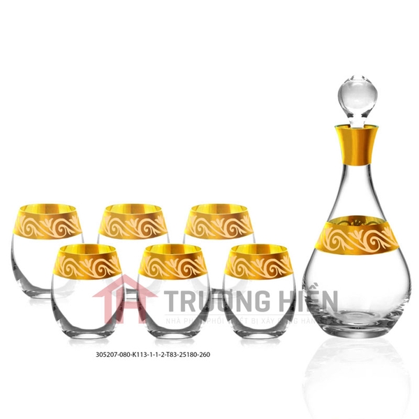 Trang trí: Bộ bình rượu 305207-25180 có kiểu dáng sang trọng được thiết kế theo phong cách Châu Âu hiện đại. Thiết kế tỉ mỉ với những họa tiết hoa ngọc lan phun cát mạ vàng 22K kiêu sa, bắt mắt người nhìn với dáng bình thon nhẹ nhàng, uyển chuyển nhưng có sức hút lạ thường, có thân ly bầu bĩnh, xứng đáng là tuyệt phẩm giúp không gian nhà thêm đẳng cấp và tinh tế.