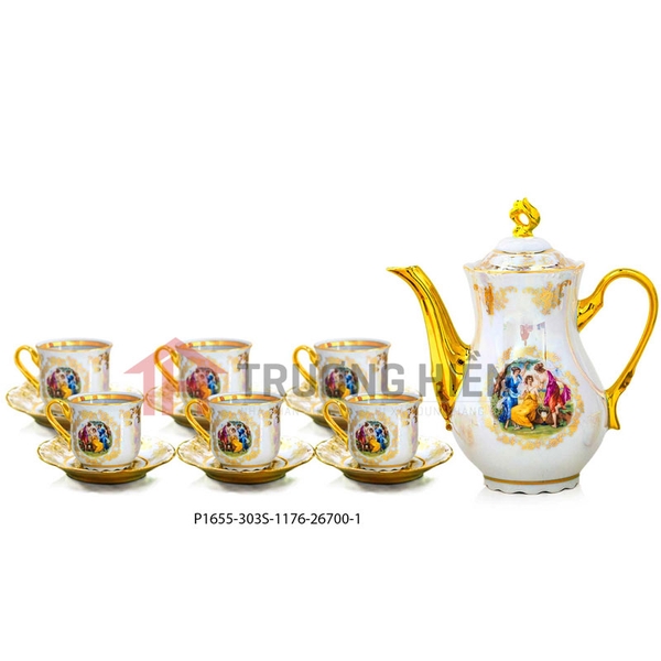 Trang trí: Bộ trà sứ P1655-303S-1176-26700-1 có kiểu dáng sang trọng được thiết kế theo phong cách Châu Âu hiện đại. Thiết kế tỉ mỉ với những họa tiết trang trí hoa văn mạ vàng tinh xảo, đẹp mắt, phối màu rất tuyệt cùng phong thái thanh cao giúp tôn lên giá trị cho sản phẩm, thu hút ánh nhìn, cho không gian thêm đẳng cấp và tinh tế.