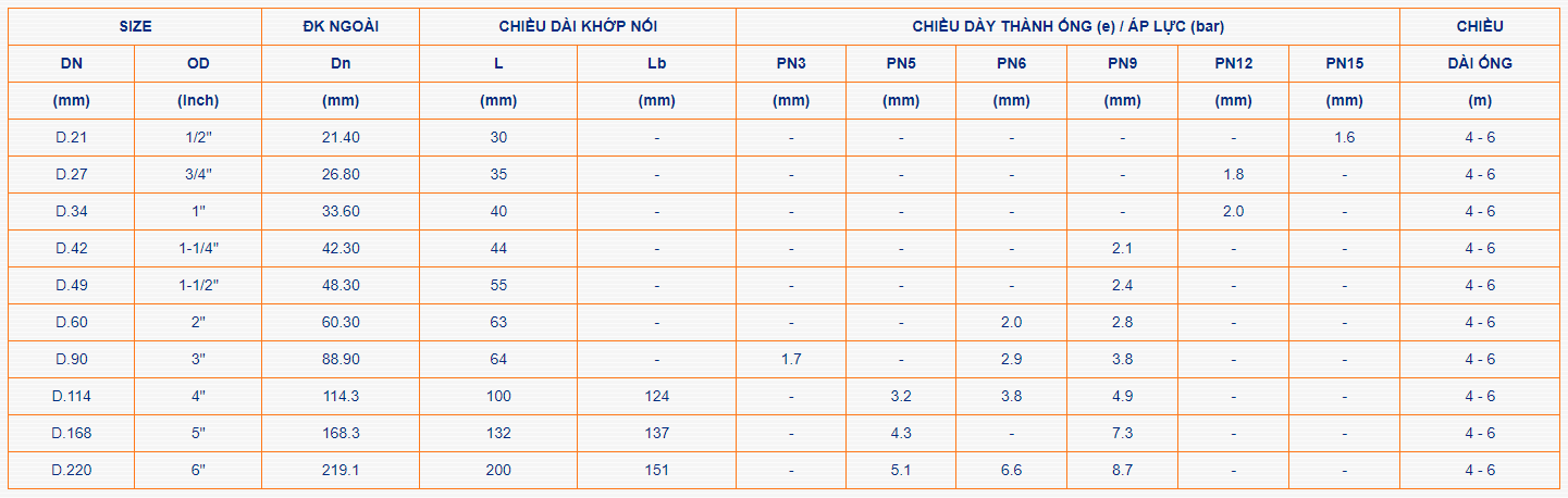 - Hệ mét có đường kính phi 21,27,34,49,69,90,114,130,168,220,63,75,110,140,160,200,225,280,315,400,450,500,560,630.