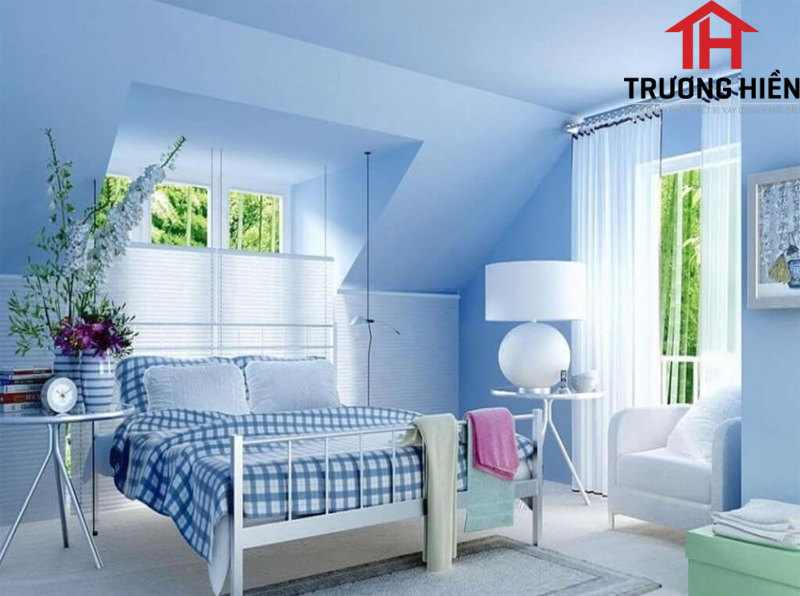 Trên thực tế, màu xanh dương nhạt là sự lựa chọn của rất nhiều các gia chủ. Bởi sự kết hợp giữa màu xanh dương nhạt và màu trắng mang lại cảm giác nhẹ nhàng, yên bình, rất thỏa mái và tự do. Ngoài ra bạn có thể kết hợp phối thêm một số phụ kiện màu hồng như gối ôm, thảm trải sàn… để mang đến sự sinh động cho không gian.