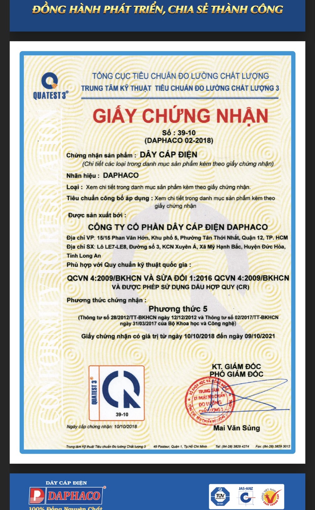 Như vậy sản phẩm dây cáp điện Daphaco được chứng nhận gần đây nhất là số 39-10 . Đây là chứng nhận của cục tiêu chuẩn đo lường chất lượng chứng nhận sản phẩm dây cáp điện nhãn hiệu Daphaco.
