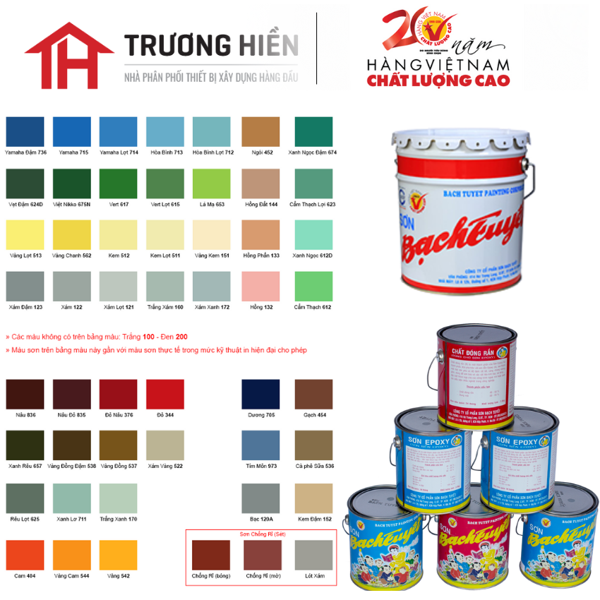- Tất cả các sản phẩm sơn Bạch Tuyết mà Trương Hiền cung cấp cho khách hàng đều được nhập trực tiếp từ nhà sản xuất, có nguồn gốc rõ ràng, chất lượng đảm bảo, giá cả cạnh tranh. Ngoài ra, Trương Hiền luôn chiết khấu cao cho khách sỉ, mua số lượng lớn, và khách có nhu cầu mở cửa hàng.