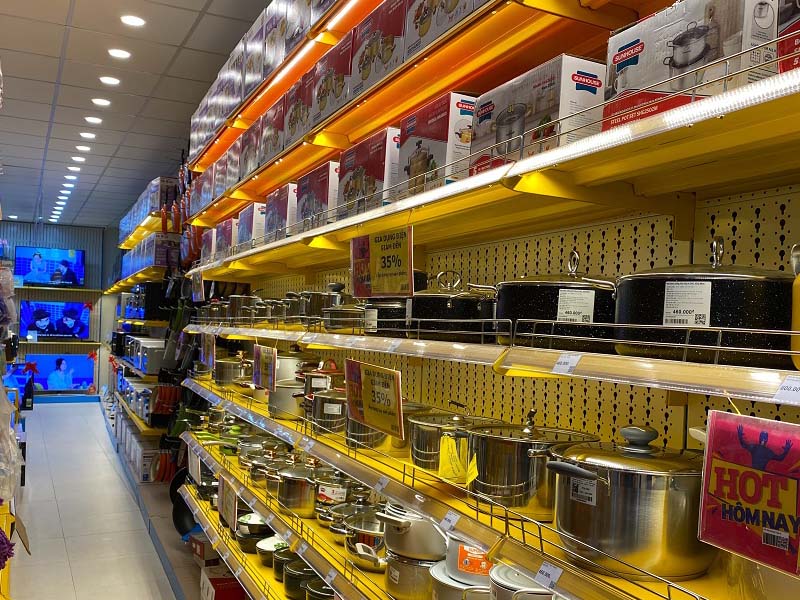 Mỗi khu vực có màu sắc và ánh sáng riêng nhưng phong cách thiết kế vẫn đồng nhất. Điểm nổi bật trong thiết kế của cửa hàng đồ gia dụng này là các ngăn tủ được thiết kế đơn giản, hiện đại và phong cách. Kệ được chia thành nhiều ngăn giúp trưng bày được nhiều hàng hơn.